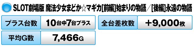 新台だった前者は全体の7割がプラス、平均ゲーム数は7,000G超、そして全台差枚数はプラス9,000枚でフィニッシュ!