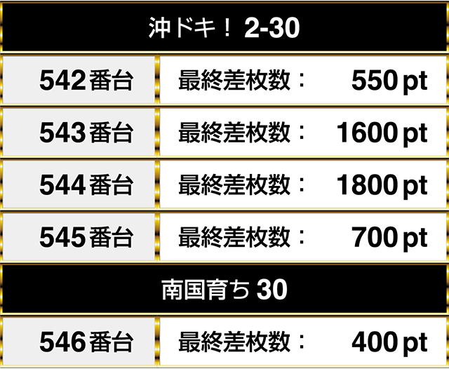閉店時には4台が連なってプラスptとなり、そのうちの2台が1000ptオーバー!!