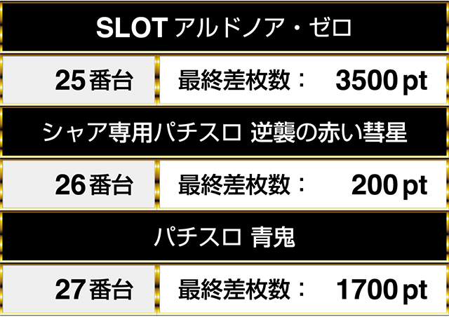 1日を通したデータをみると、25番台の『SLOTアルドノア・ゼロ』から27番台の『パチスロ 青鬼』までにプラスptが並んだ。