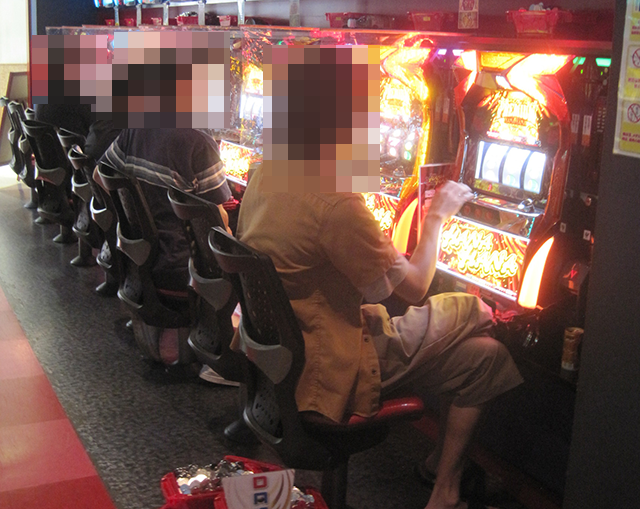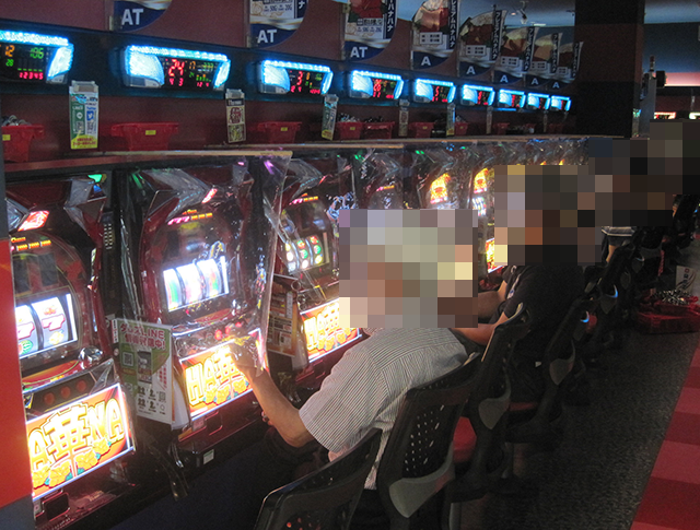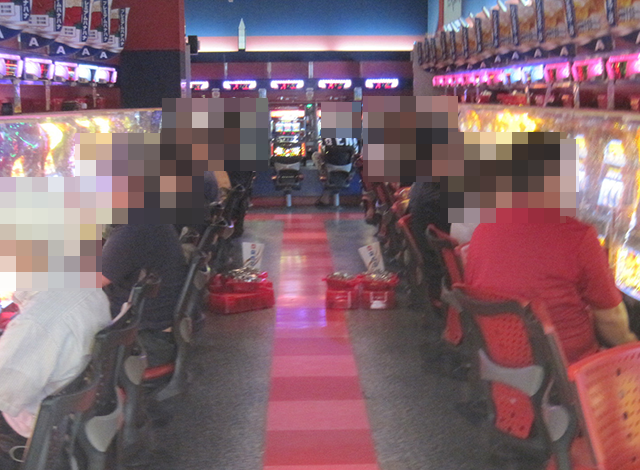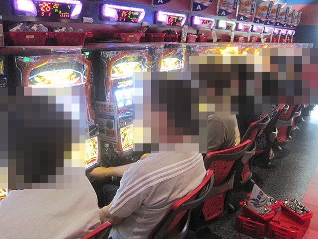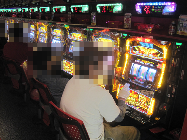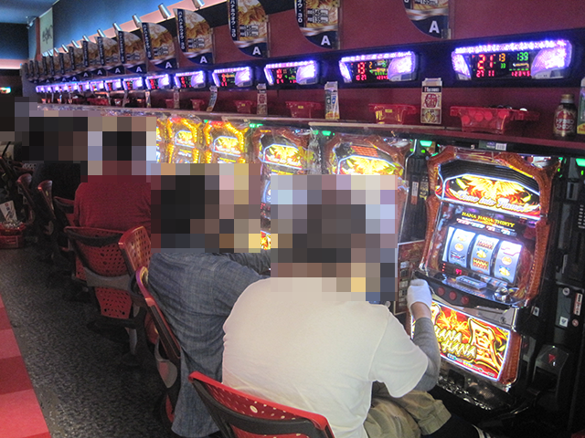 16時半を過ぎた頃のパチスロでは、15台が設置されている「ハナハナ鳳凰-30」がとくに盛況。