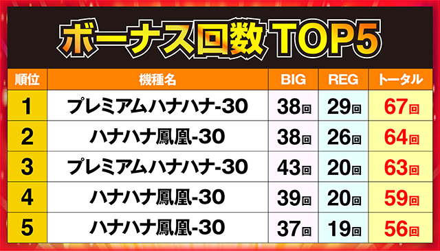 1位にはボーナス回数67回の「プレミアムハナハナ-30」、2位には64回の「ハナハナ鳳凰-30」が入賞するなど、どちらの機種も好成績を残した。