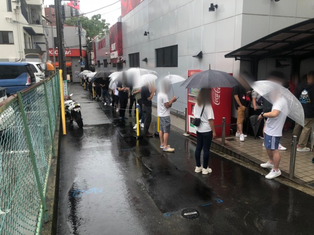 お盆休み期間、雨天で梅雨の様な蒸し暑い悪天候、13日の金曜日といういささかゲンの悪い日にもかかわらず、傘をさして朝イチから107人のファンが列をなし、開店時間を静かに待っていた。