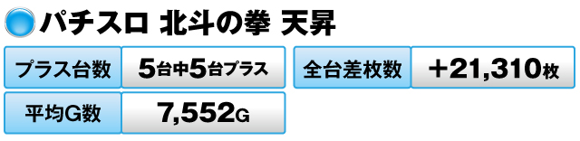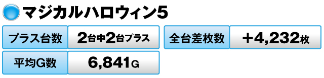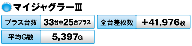平均ゲーム数は7,500Gを超え、全台がプラス、『マイジャグⅢ』には劣ったがそれより少ない台数の5台で全台差枚数+21,000枚強を成し遂げた。