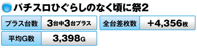 両機種共に全台がプラス、『ひぐらし』は稼働やや少&『マジハロ5』は7,000G弱と高稼働で、どちらも+4,000枚強をゲット。