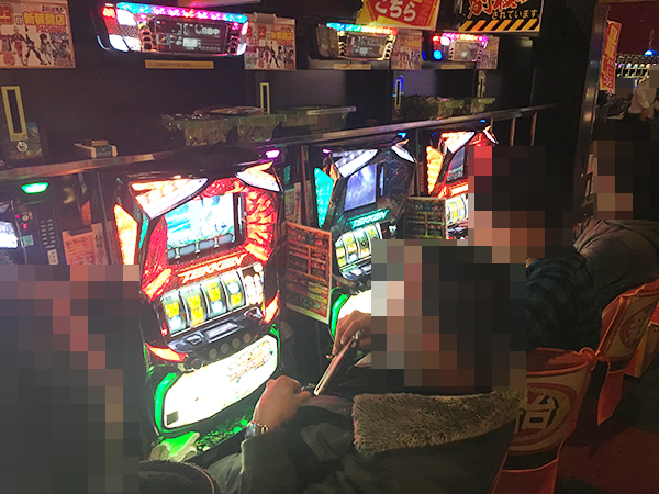 15時を過ぎた頃の1000円/47枚パチスロでは、「バジリスク~甲賀忍法帖~絆」が朝イチから変わらずに好評。なかには、機種の性能をフルに発揮しているようなプレイヤーもおり、盛り上がっていた。