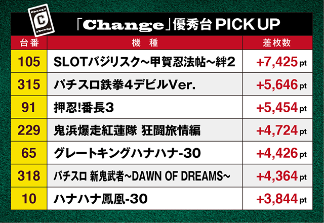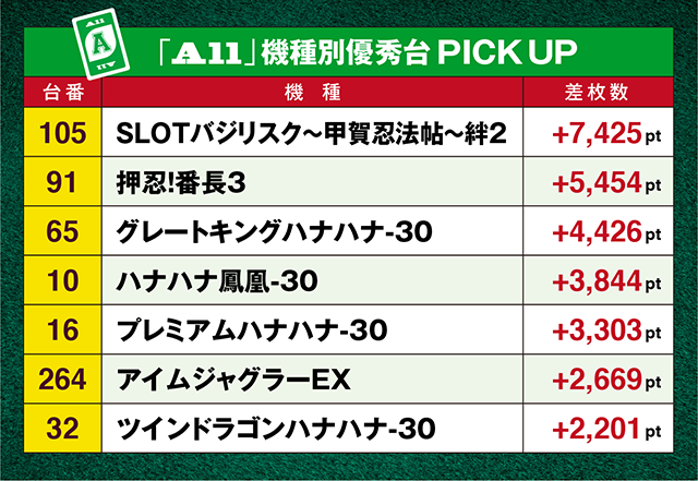 ボーナスタイプだけでなく、「SLOTバジリスク~甲賀忍法帖~絆2」が+7,425pt、「押忍!番長3」が+5,454ptを記録と、AT機やART機にも好成績を残した台があった。