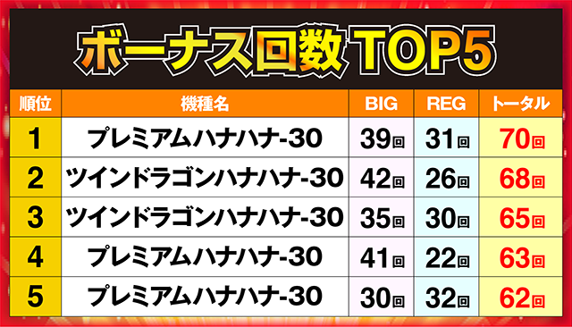 5台すべてがボーナス回数60回を超えているなかで、1位に輝いた台は70回を記録した。