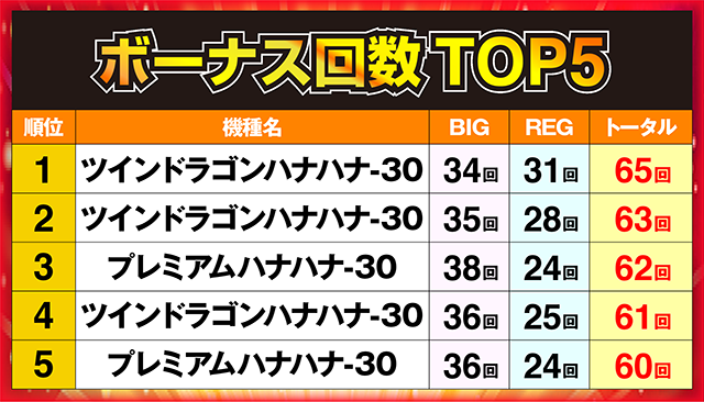 大接戦のなかで、65回を記録した「ツインドラゴンハナハナ-30」が1位の座に輝いた。