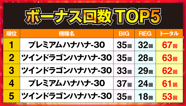 堂々の1位に輝いたのは、ボーナス回数67回を記録した「プレミアムハナハナ-30」の1台であった。