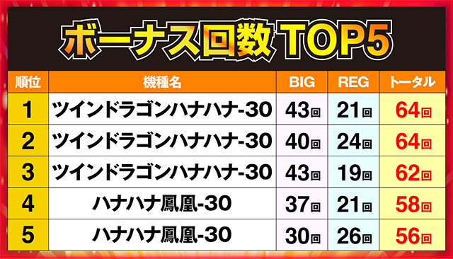 上位3台はボーナス回数60回超えの「ツインドラゴンハナハナ-30」!