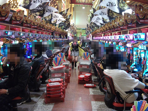 15時半をまわる頃の4円パチンコでは、「CR牙狼 魔戒ノ花」の盛り上がりが際立っていた。
