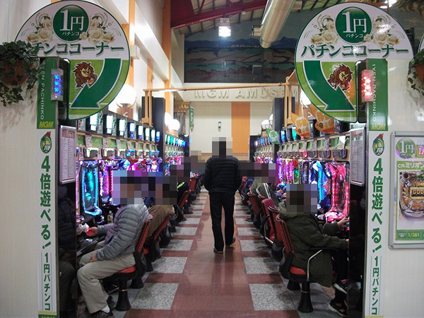 1円パチンコもほとんどの席が埋まるほど高稼働。