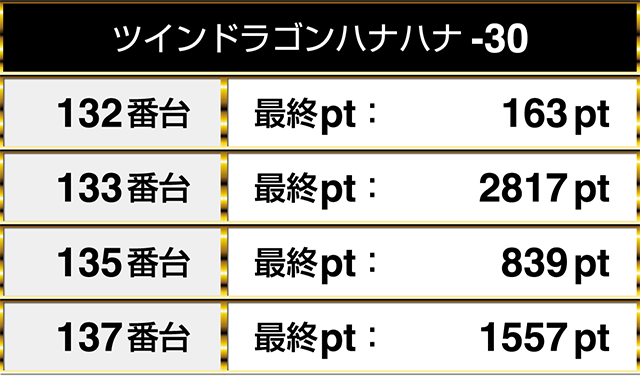 『ツインドラゴンハナハナ-30』の4台がプラスptとなり、そのうちの1台は2000ptオーバー!!