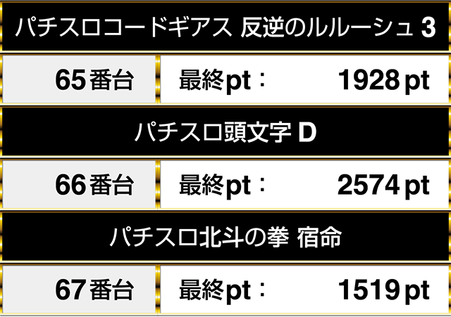 『パチスロコードギアス 反逆のルルーシュ3』と『パチスロ北斗の拳 宿命』は、どちらも1000pt以上を記録!!