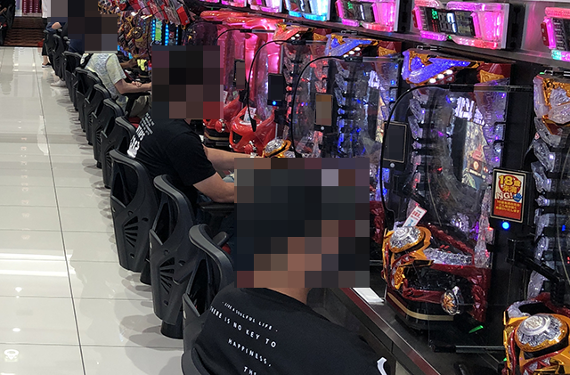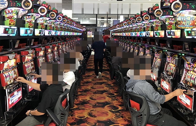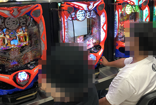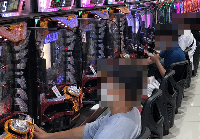4台ずつ、むかいあって設置されており、どちらのシマでもプレイヤーは遊技を堪能中。
