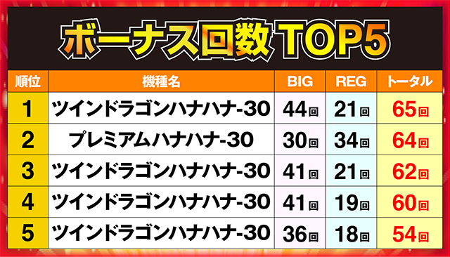 「ツインドラゴンハナハナ-30」は4台がTOP5入りをはたし、ボーナス回数65回を記録した1台が首位を獲得。