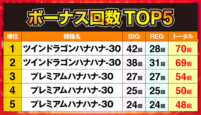 1位と2位には「ツインドラゴンハナハナ-30」が入り、ボーナス回数70回を記録した1台が首位を獲得!