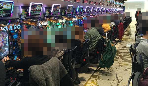 翌日の29日も朝から来店しているプレイヤーが多く、「バジリスク~甲賀忍法帖~絆」や新台の「パチスロ偽物語」などがパチスロではすぐに満席。