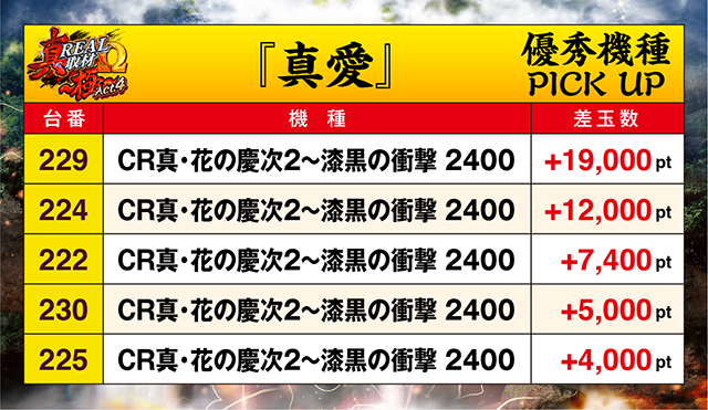 「CR真・花の慶次2~漆黒の衝撃 2400」の229番台が+19,000pt!!
