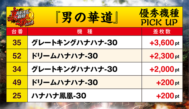 「グレートキングハナハナ-30」の34番台と35番台がならんで+2,000pt以上を記録!