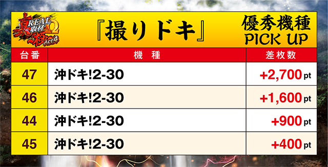 「沖ドキ!2-30」の44番台から47番台までの4台がならんでプラスpt!