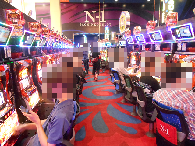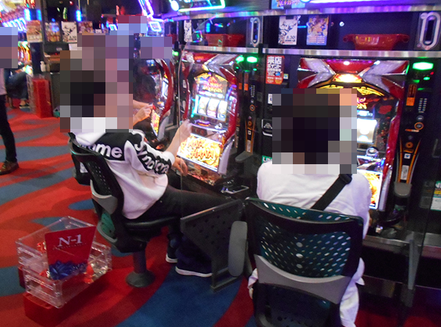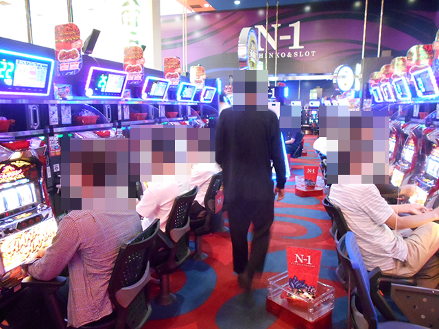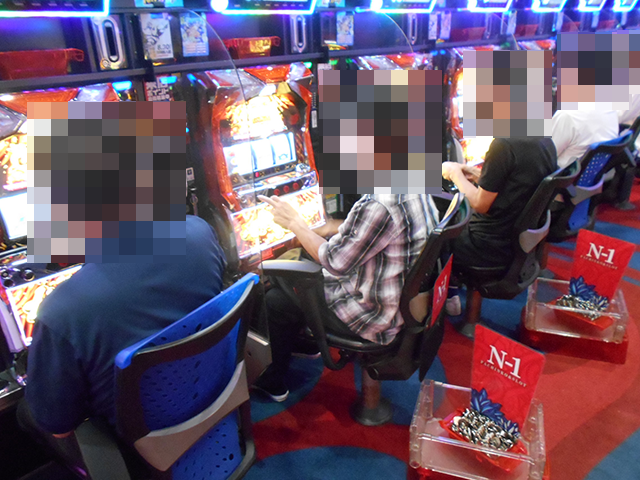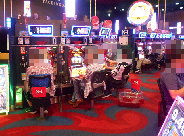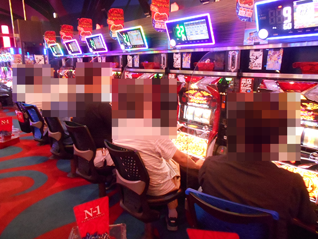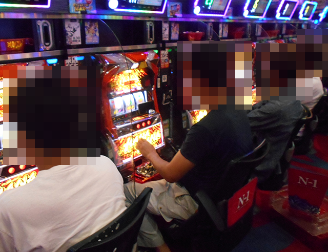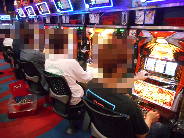 「プレミアムハナハナ-30」にも、遊技を満喫しているといったプレイヤーが多数。イキイキとした姿がズラリと並んでいる光景は壮観だ。
