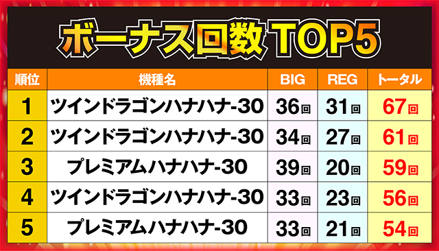 上位2台はボーナス回数60回以上を記録した「ツインドラゴンハナハナ-30」!