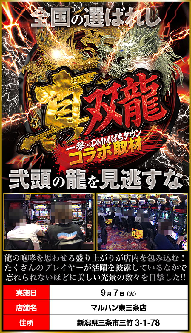 「マルハン東三条店」を舞台にして、「真双龍」をおこなった。