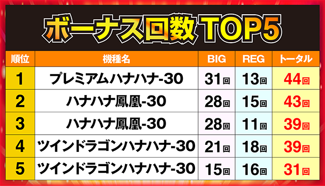 ボーナス回数44回の「プレミアムハナハナ-30」が単独で首位を獲得!