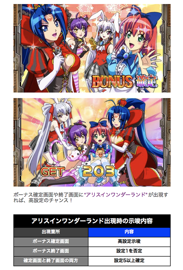 ボーナス確定画面or終了画面が“アリスインワンダーランド”ならば高設定のチャンス、確定画面と終了画面の両方で出現すれば設定5以上が濃厚だ。