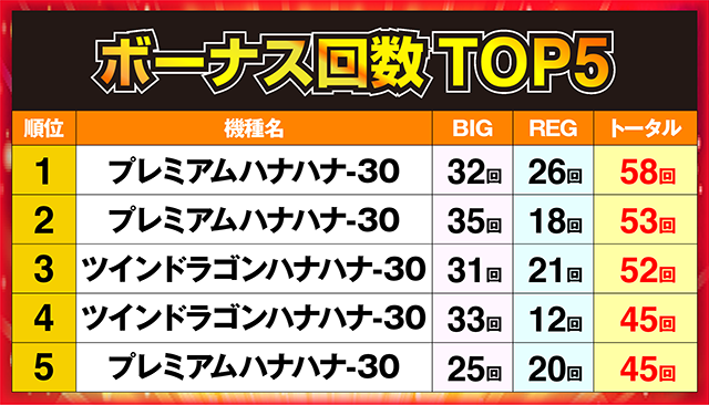 上位3台のボーナス回数は50回を超え、58回を記録した1台が首位を獲得した。