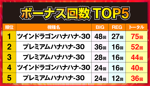75回のボーナスに当選した「ツインドラゴンハナハナ-30」の1台が首位を獲得!