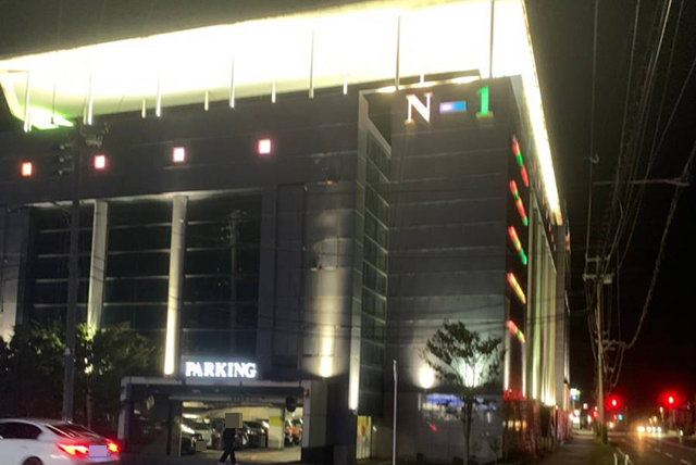 舞台の「エヌワン豊栄店」に到着したのは19時頃。あたりがすっかり暗くなっているなかで、ライトアップされたホールは存在感を放っていた。