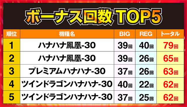 2位から5位までの4台もボーナス回数60回以上と好記録を残した。