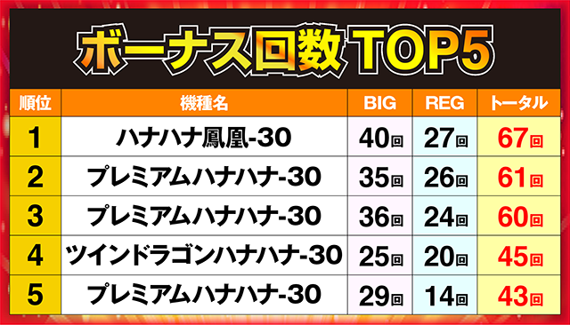 2位と3位にランクインした「プレミアムハナハナ-30」もボーナス回数60回以上を記録した。