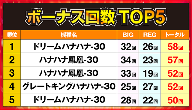 堂々の1位に輝いたのは、58回のボーナスに当選した「ドリームハナハナ-30」の1台であった。