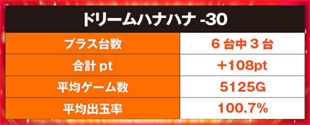 最終的な平均ゲーム数は、「ハナハナ鳳凰-30」とおなじく5000Gオーバー。プラスでこの日を終えたのは6台中3台であった。