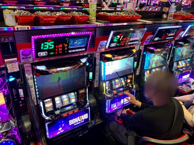 取材日当日新台導入から間もなかった&5台設置の『パチスロ バイオハザード7 レジデント イービル』だ。