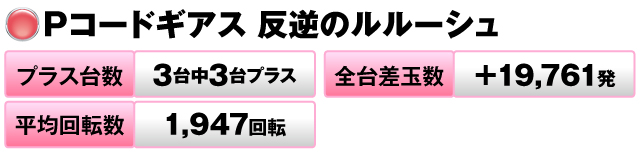 全台差枚数がプラス1万枚に迫ろうかという出玉だったのが『パチスロコードギアス 反逆のルルーシュ3』。