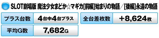 続いては全台差枚数プラス8千~7千枚クラスの2機種。『SLOT劇場版 魔法少女まどか☆マギカ[前編]始まりの物語/[後編]永遠の物語』『パチスロガールズ&パンツァー 劇場版』だ。