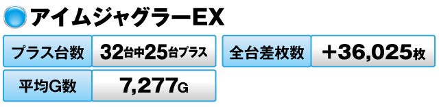 中でも同店では32台と最多設置となる『アイムジャグラーEX』が圧巻の成績を叩き出した。