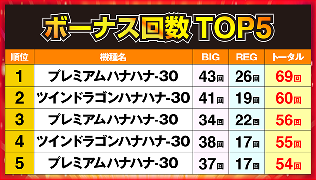 1位にはボーナス回数69回の「プレミアムハナハナ-30」がランクイン!