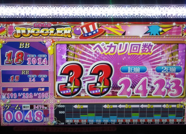 16時頃の『ゴーゴージャグラー』において、3476Gを消化した時点でボーナス回数が33回の台を目にした。
