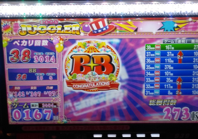総ゲーム数が3684Gで、ボーナス当選回数が38回の台も発見。