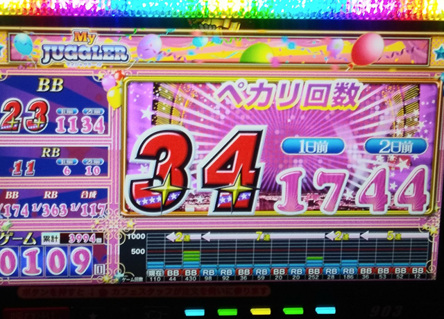 活気のあるシーンだけでなく、3994Gを消化した時点でボーナス当選回数が34回の台も確認した。