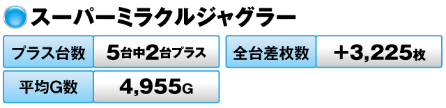 その他、『スーパーミラクルジャグラー』も、5台中2台がプラスで全台差枚数は+3,225枚をマークした。