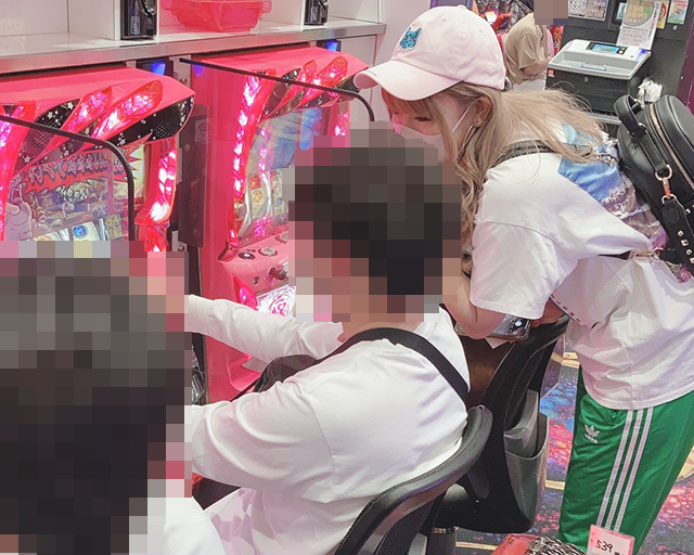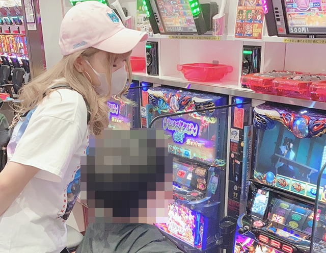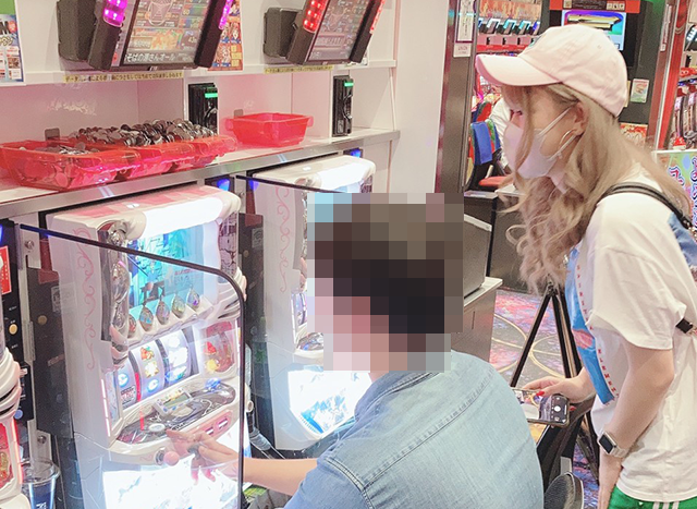 写真を撮りつつ、プレイヤーの活躍ぶりに注目をしていた山崎ひびき。気になるボイスの発生やART直撃など、さまざまな情報が聞けたようだ。