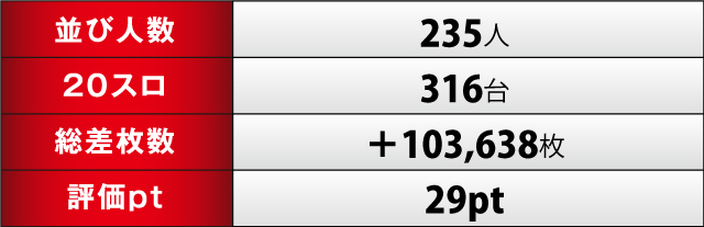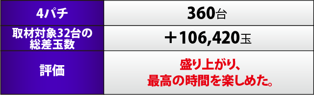 今回、21.74スロでは全台トータル差枚数+103,638枚と爆裂! また4パチの取材対象32台でもトータル差玉数+106,420玉と大台を突破し、両ジャンル揃った完全勝利に終わった。さすが越後の雄DAMZグループ、朝イチの並びの多さを裏付けたように、人気店の実力は確かなものと嚙み締めた一日となった。