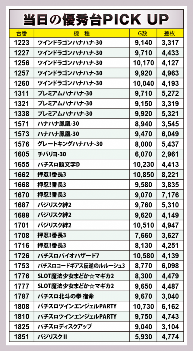 この日の最注目は『押忍!番長3』。全20台設置の中、5台で差枚数プラス2万7千枚を突破! その他、ハナハナシリーズを中心とした沖スロ12台にもプラス3千~5千枚クラスがゴロゴロ。好調に比例して稼働も抜群、中には1万ゲームを超える台も見られたほど。