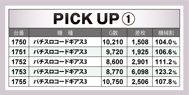 また、横並び5台が好調だったのは『パチスロコードギアス 反逆のルルーシュ3』。差枚数+6千枚の台を筆頭に全ての台がプラス、トータル+1万5千枚近くに!